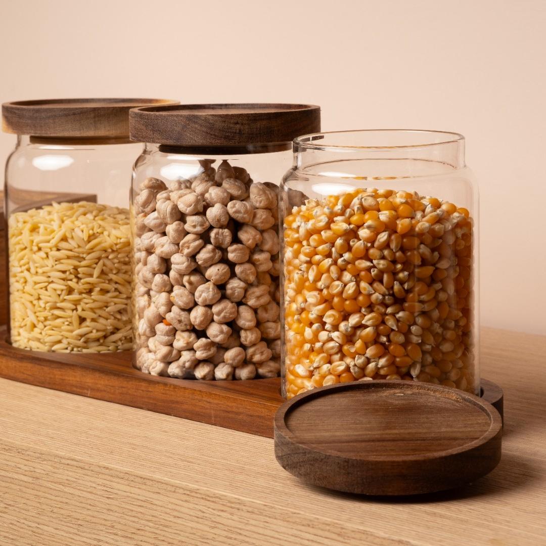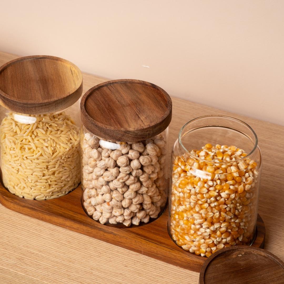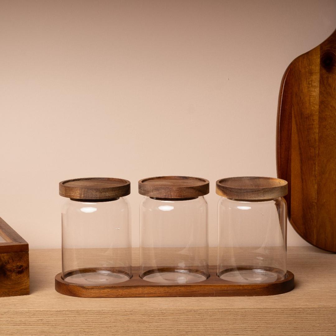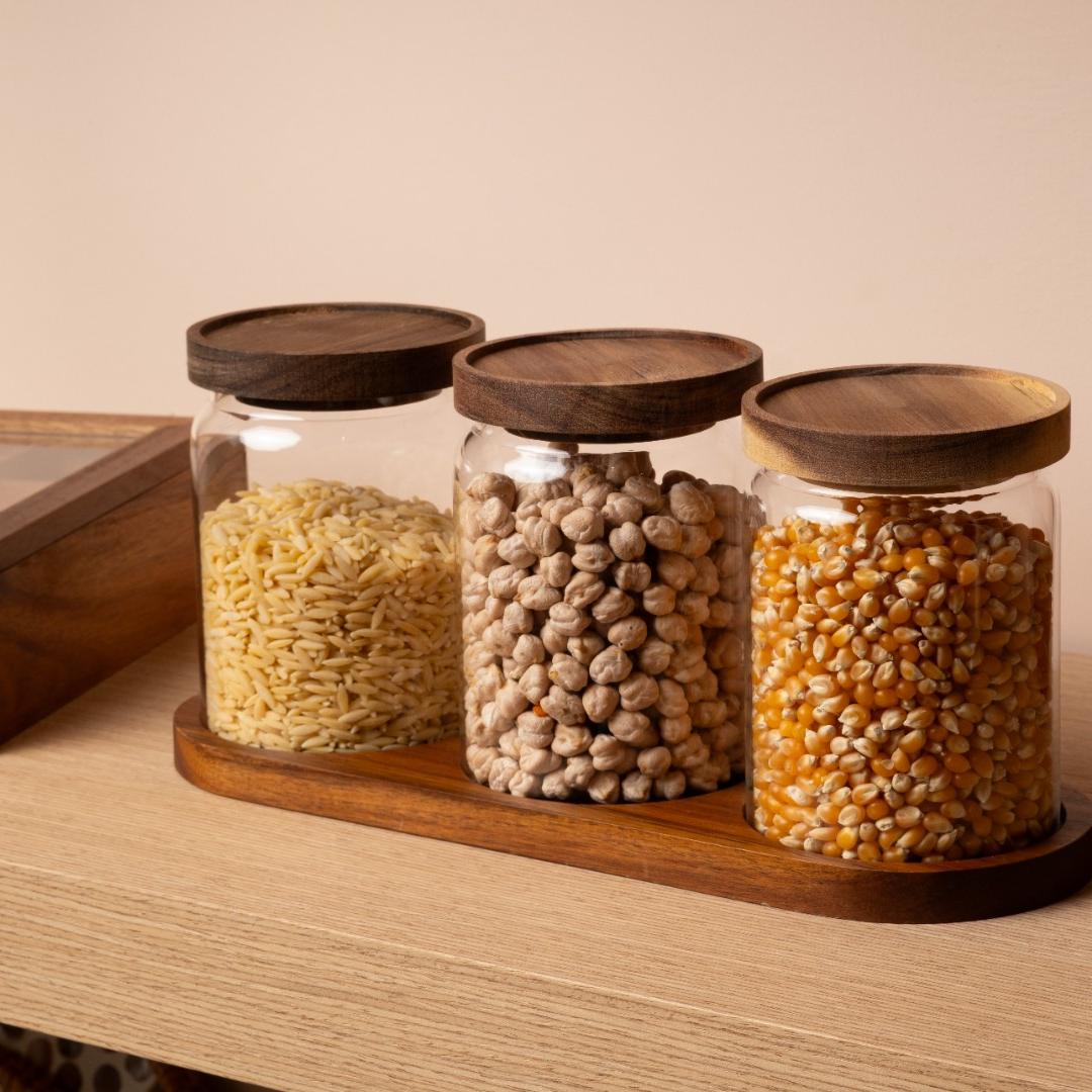 Akasya Kapaklı ve Standlı 3’lü Cam Saklama Kabı Seti
