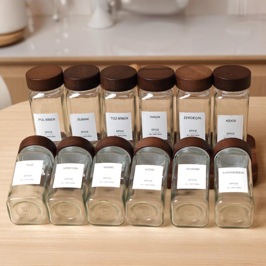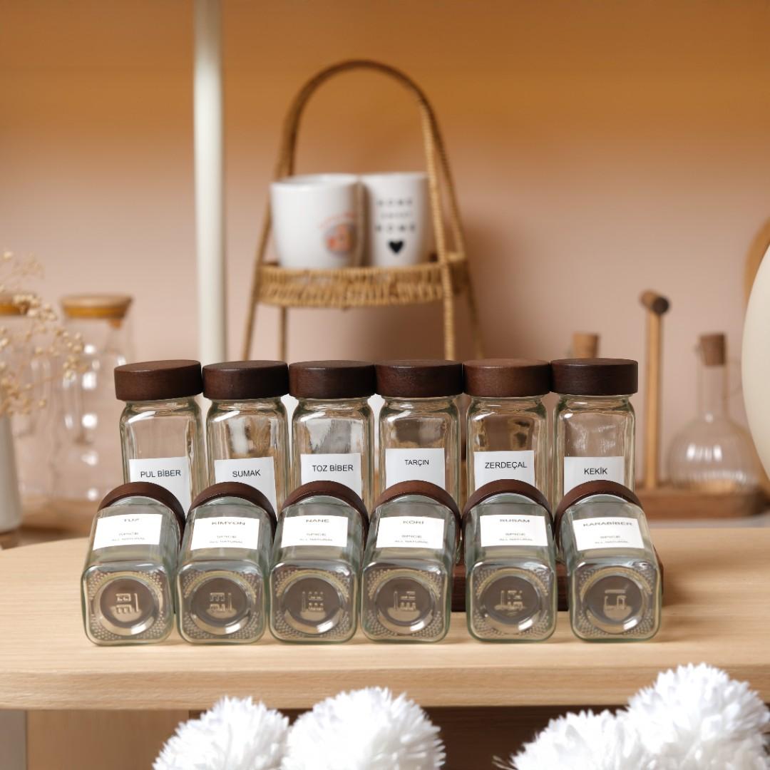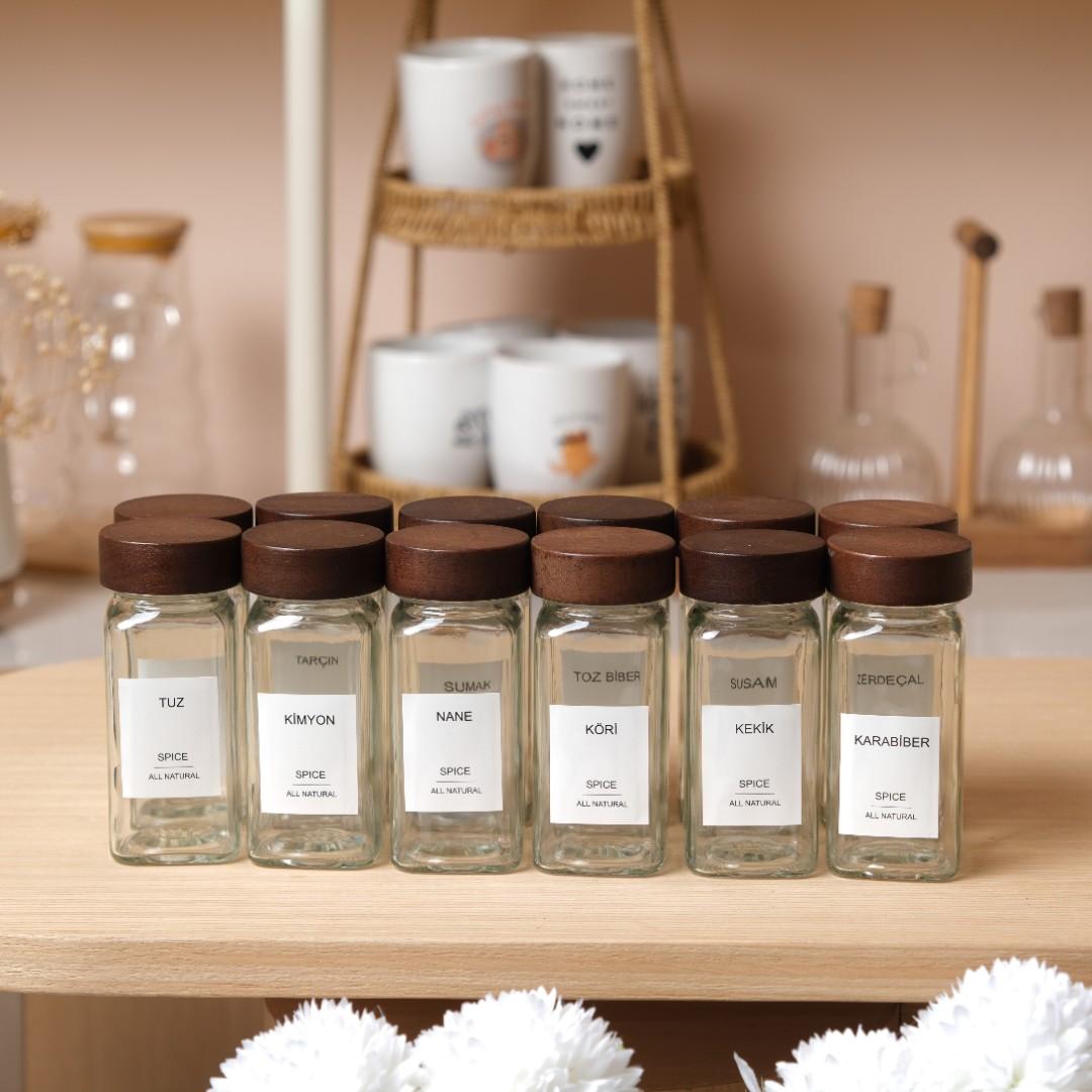 Mutfakta düzen ve şıklığı bir arada sunan bu 12'li cam baharat kavanoz seti, tamamen doğal ve minimalist bir tasarıma sahiptir.